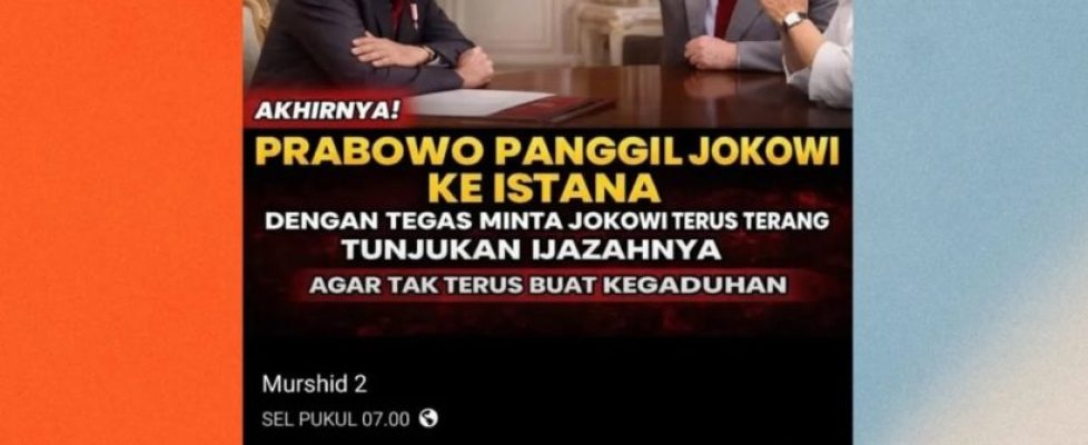 Hoaks: Presiden Prabowo Subianto memanggil mantan Presiden Joko Widodo ke Istana Merdeka untuk menunjukkan ijazah aslinya.